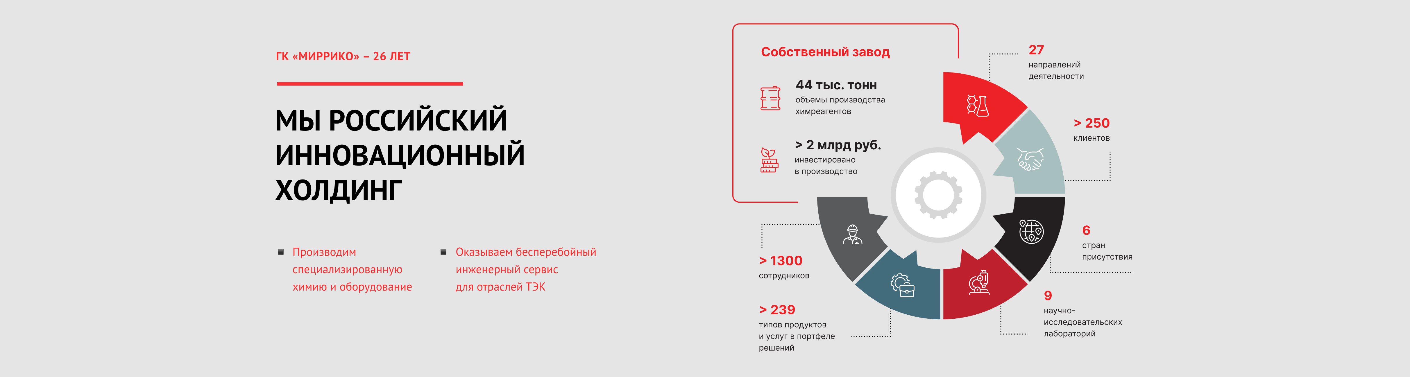 ГК «Миррико» – российский инновационный холдинг со стандартизированными и специализированными решениями для областей ТЭК и обрабатывающей промышленности, добычи полезных ископаемых. Осуществляет технологический инжиниринг, оказывает сервис, производит промышленную химию и оборудование. Развивает собственное производство на территории РФ и СНГ, модернизирует его под нужны рынка.