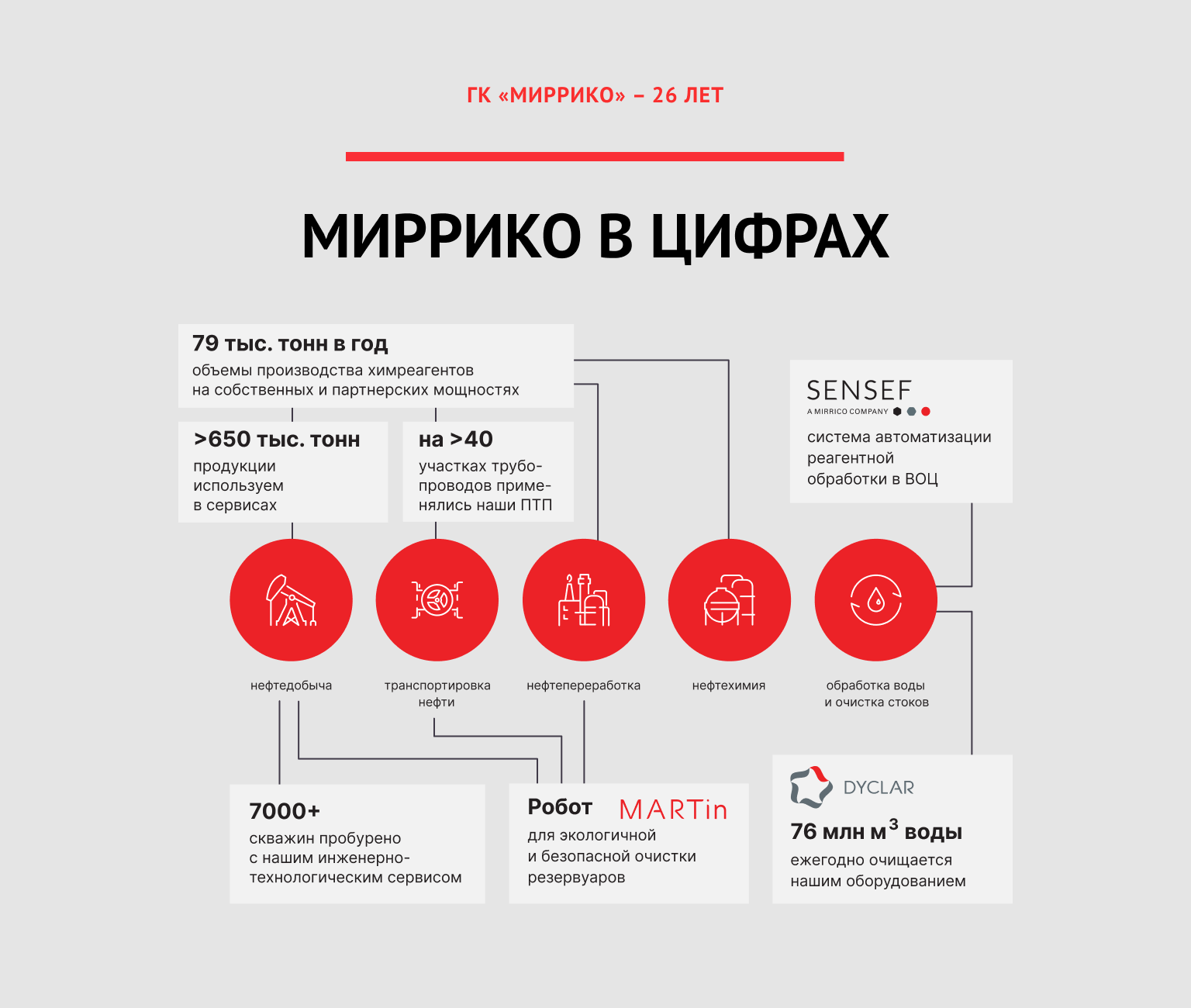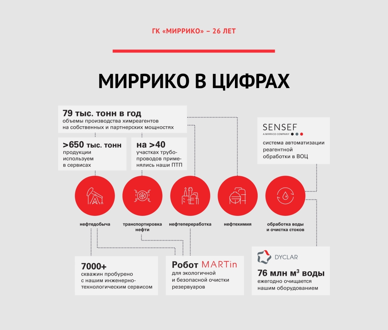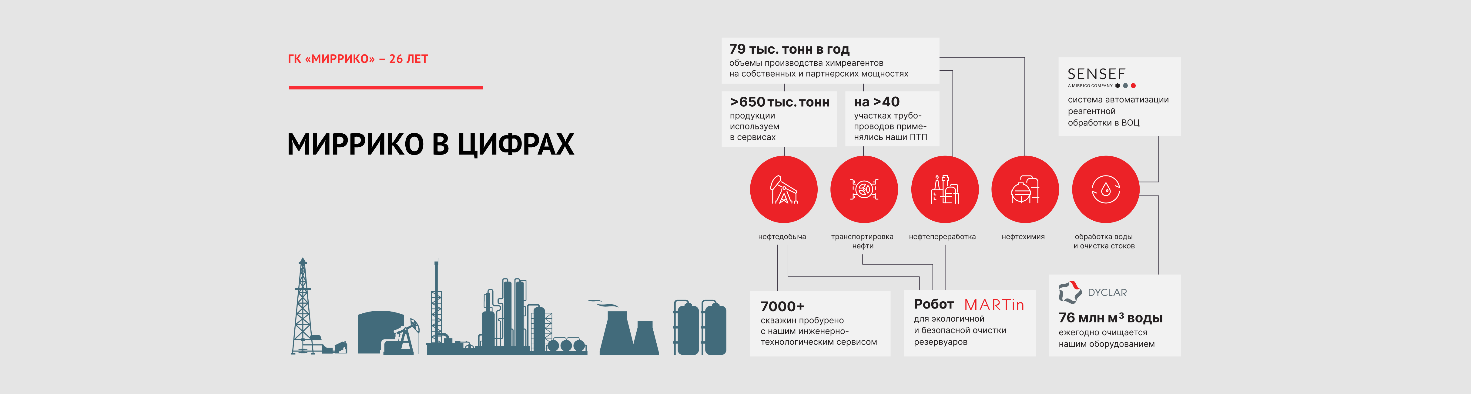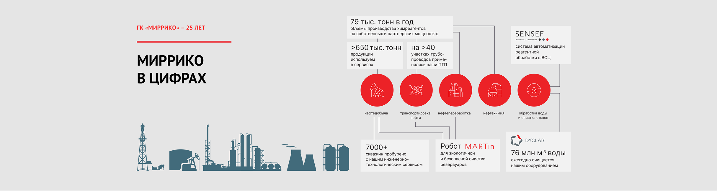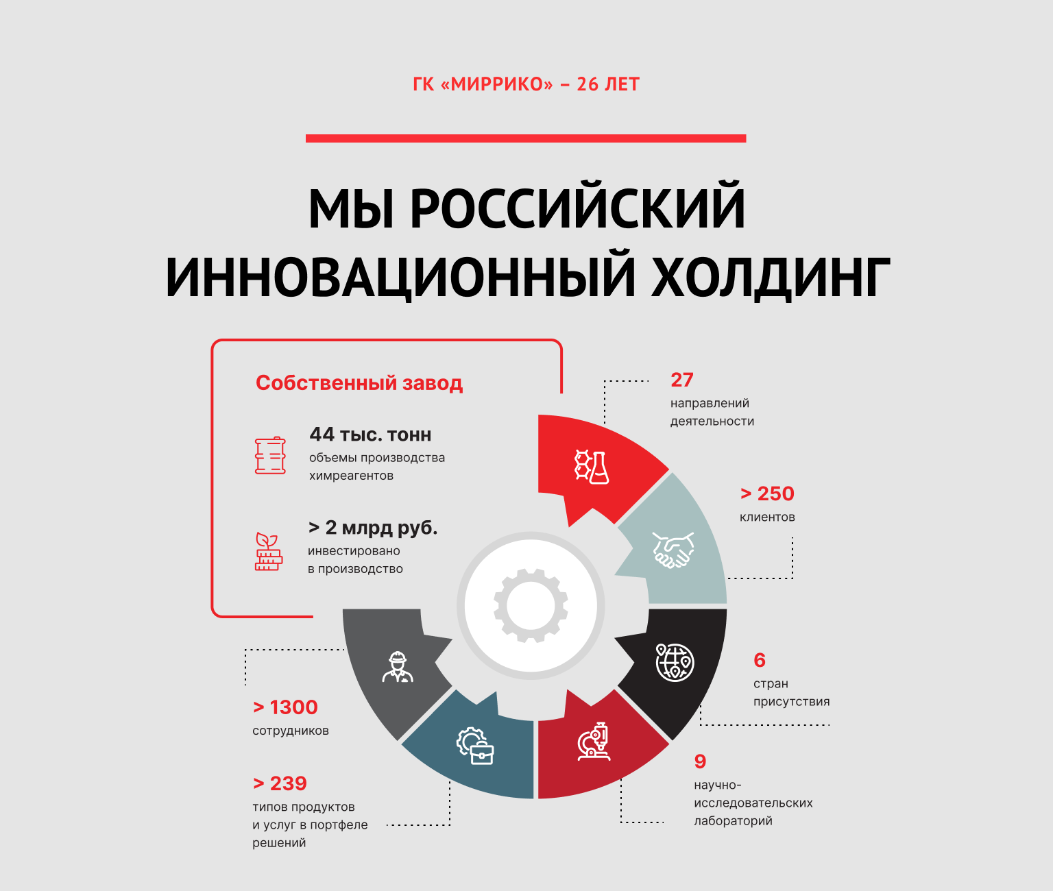 25 лет компании доверяют оптимизацию части процессов и минимизацию негативных последствий. Смело берется за создание новых решений, опережая и предвосхищая потребности рынка. Имея в портфеле все возможности, разработки и необходимые навыки, именно ГК «Миррико» подхватила знамя лидера после ухода иностранных конкурентов с рынка химических решений.